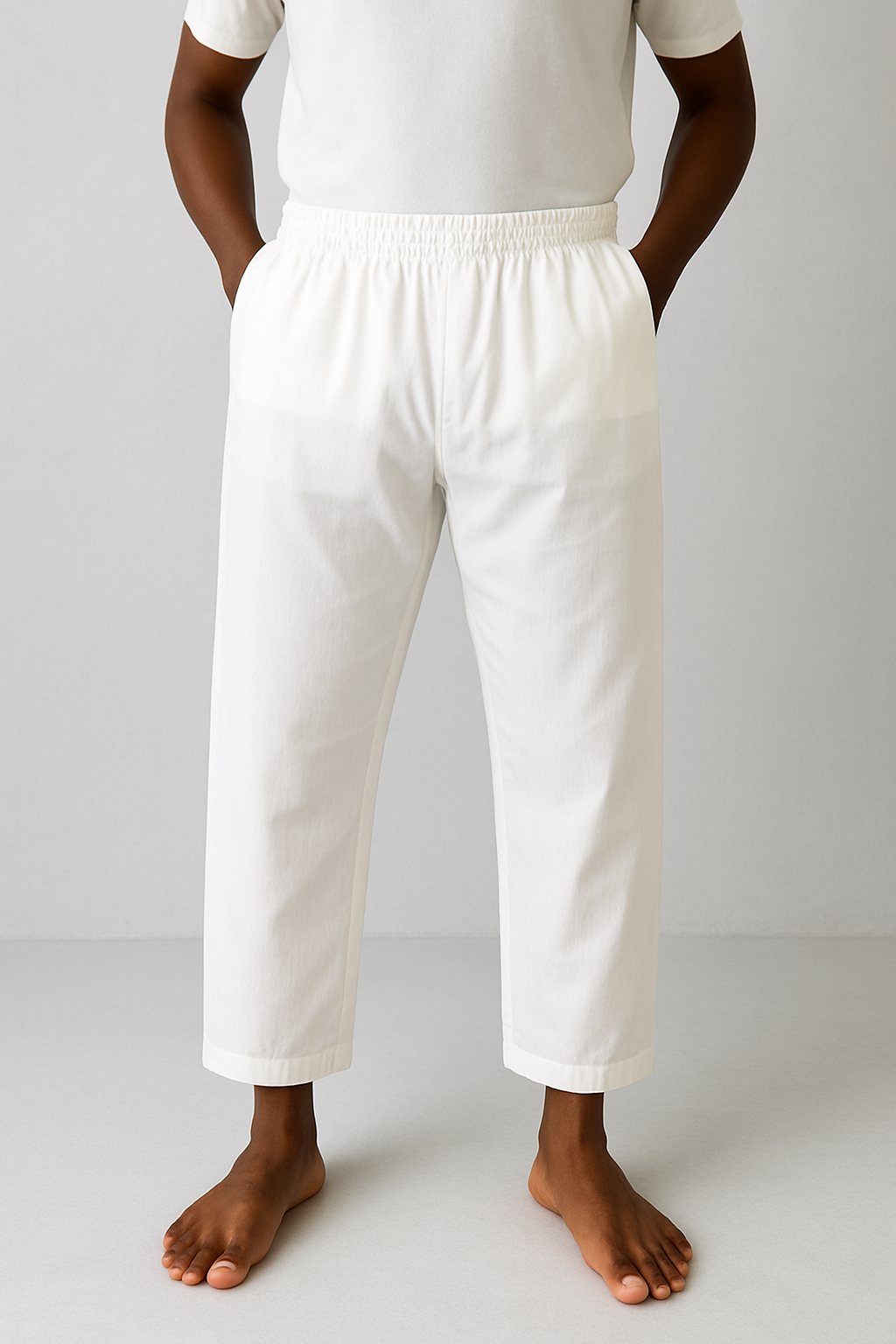 سروال جلابية سوداني أبيض تقليدي، يتم ارتداؤه عادةً مع الجلابية السودانية البيضاء أو الملونة، كما يمكن استخدامه كملابس منزلية مريحة. تصميمه الواسع يوفّر حرية الحركة والتهوية، خيار مثالي للراغبين في الجمع بين الراحة والأصالة في اللبس السوداني التقليدي.